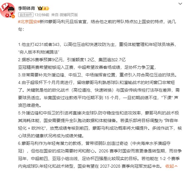 “蒙哥馬利作為年輕有潛力的教練,曾帶領(lǐng)弱隊(duì)創(chuàng)造過(guò)奇跡(中央海岸水手澳超奪冠),但他在國(guó)安的成功需要時(shí)間和耐心。2026賽季對(duì)國(guó)安而言更像是轉(zhuǎn)型期,而非爭(zhēng)冠年,中超前四、亞冠小組出線、足協(xié)杯四強(qiáng)是比較現(xiàn)實(shí)的目標(biāo)。若他能在1-2個(gè)賽季內(nèi)完成球隊(duì)年輕化和戰(zhàn)術(shù)轉(zhuǎn)型,國(guó)安有望在2027-2028賽季向冠軍發(fā)起沖擊。”